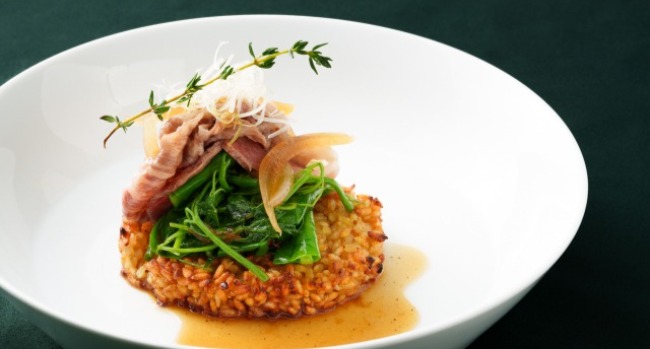 主餐將油花細緻的 A4 和牛以日式壽喜燒方式桌邊烹調,搭配義式 Riso in Cagnone 技法演繹的鍋巴飯—米粒先煮熟後濾去水分,再以叻沙湯與多款義式香料慢火熬煮。