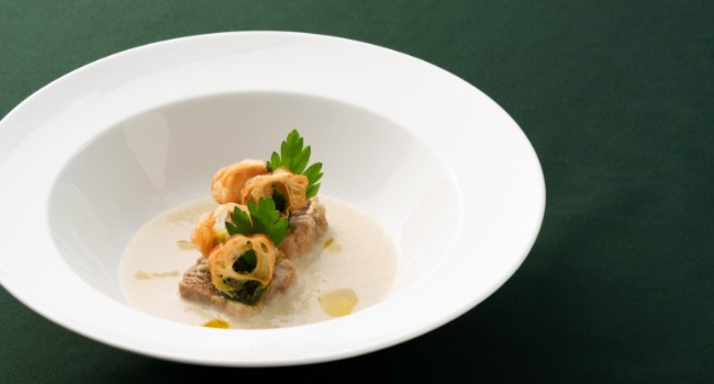 湯品以義式 Ribollita 手法融合肉骨茶精華,加入花椰菜打製成濃湯,重新詮釋排骨蘿蔔湯的熟悉風味,讓熟悉滋味在轉化中綻放全新層次。